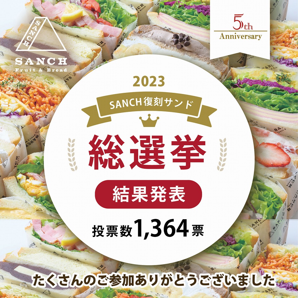この度、4月15日~5月7日の期間、5周年を記念して開催いたしました復刻サンドの総選挙を店頭・投票フォームにて沢山のお客様にご投票いただきました!