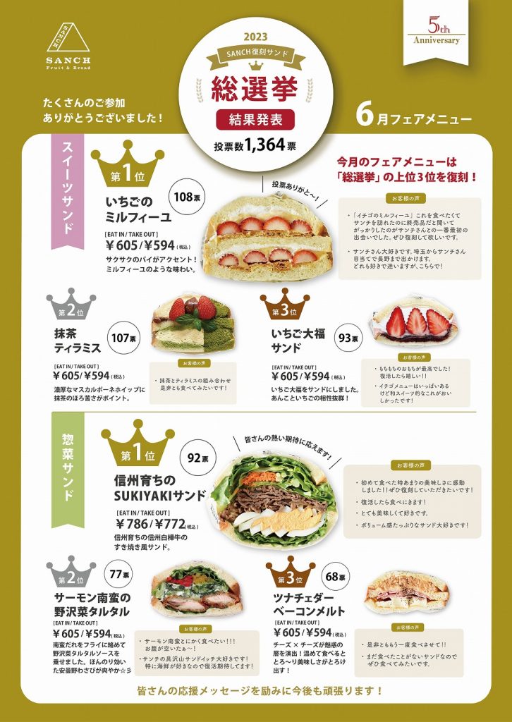 皆様のご投票にて決定いたしました上位3位のスイーツ系サンド、お食事系サンドが復刻フェアメニューとして6月1日より 店頭に登場いたします!(※SANCH安曇野Garden&Cafeにつきましては、6月6日より復刻フェアメニューが店頭に登場いたします)