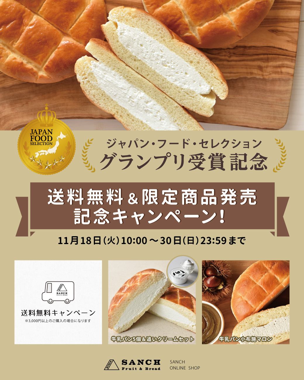 『SANCHの牛乳パン』がジャパンフードセレクションで最高評価の『グランプリ』を受賞しました。