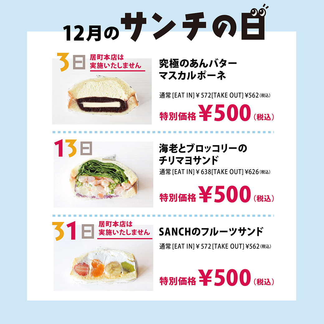 いつもSANCHをご利用いただき、誠にありがとうございます。12月のサンチの日のスケジュールをお知らせいたします。